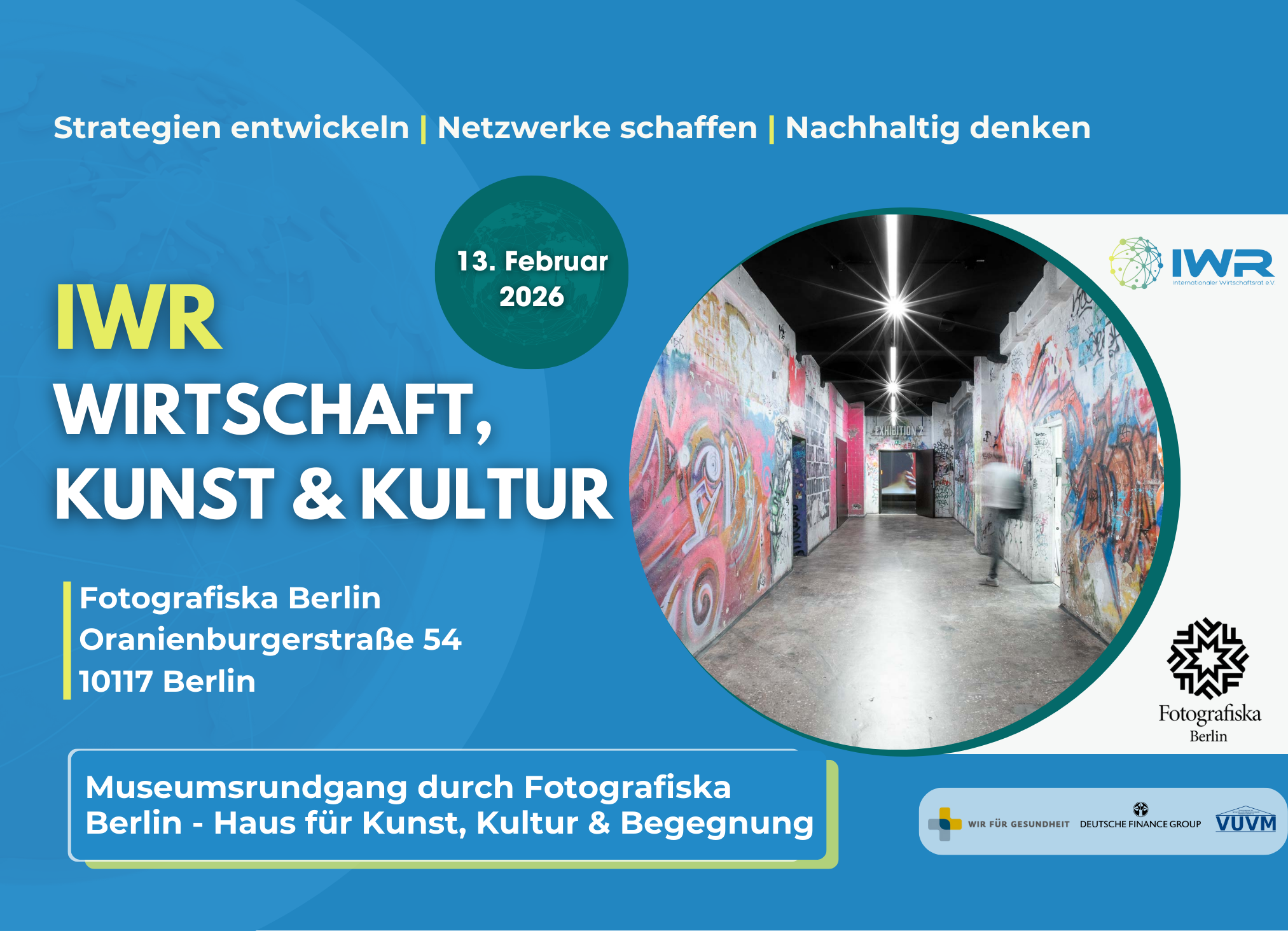 Wir freuen uns sehr, euch gemeinsam mit der Allianz der Verbände e.V. zu einer weiteren Veranstaltung im Rahmen unseres exklusiven Formats IWR Wirtschaft, Kunst & Kultur einzuladen. Am 13. Februar werden wir zusammen an einem Rundgang durch das Fotografiska Berlin teilnehmen, einem international renommierten Haus für zeitgenössische Fotografie, visuelle Kunst und gesellschaftlichen Dialog im Herzen der Hauptstadt.